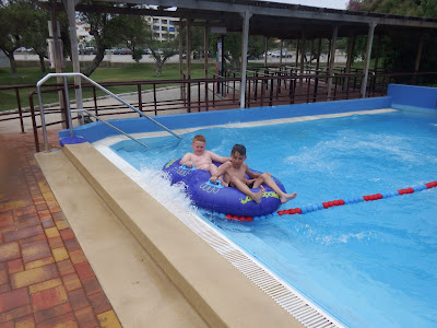 | Joshua and B playing on the rings in the 3m deep pool. |
