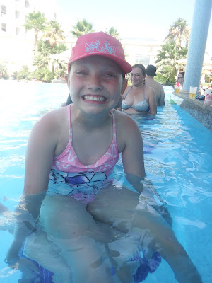 On the beach me and Josh spent the afternoon catching these tiny little jelly fish. We ended up filling about 3 cups of which Holly was making a little exhibit on the beach. Back in the pool area the entertainment staff set up a body board game where you stood up on a body board and then after about 15ft had to jump over a rope and land back on the body board. Holly only went and nailed it first time!